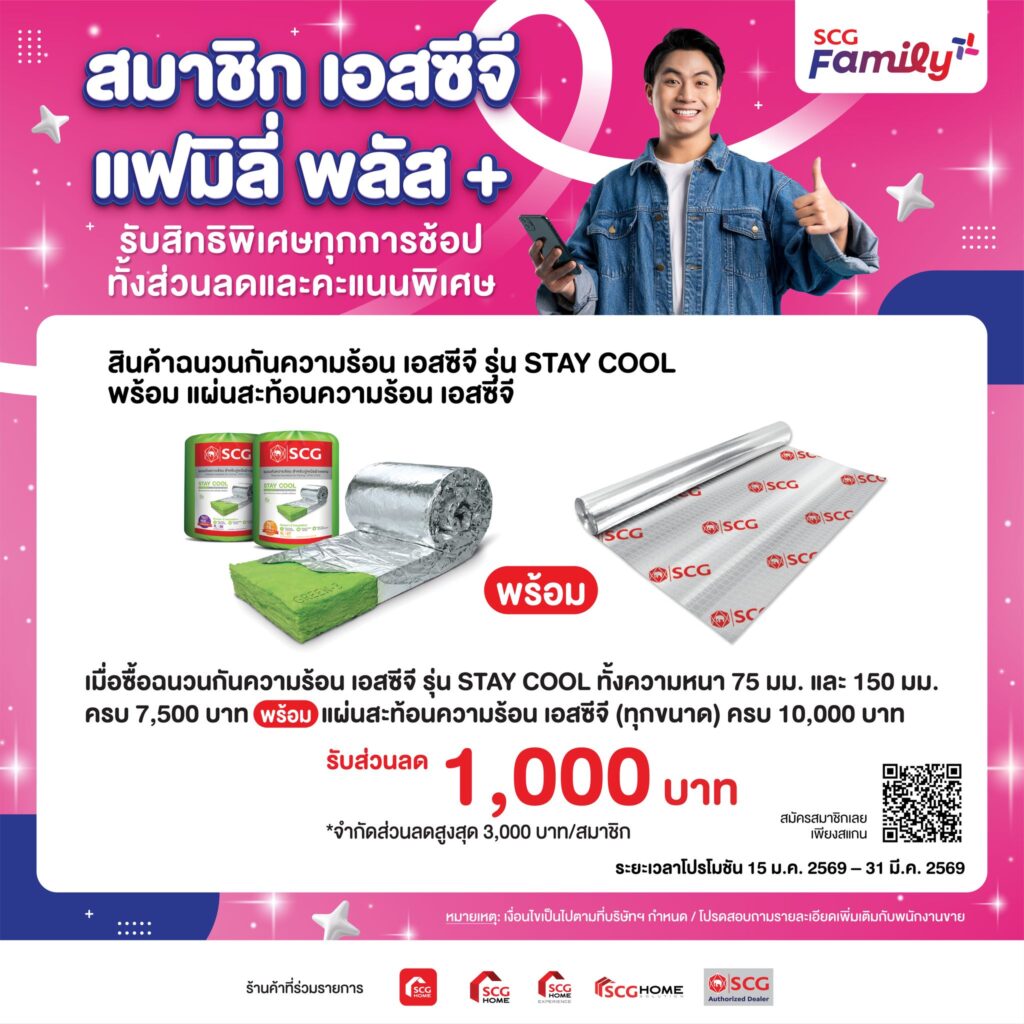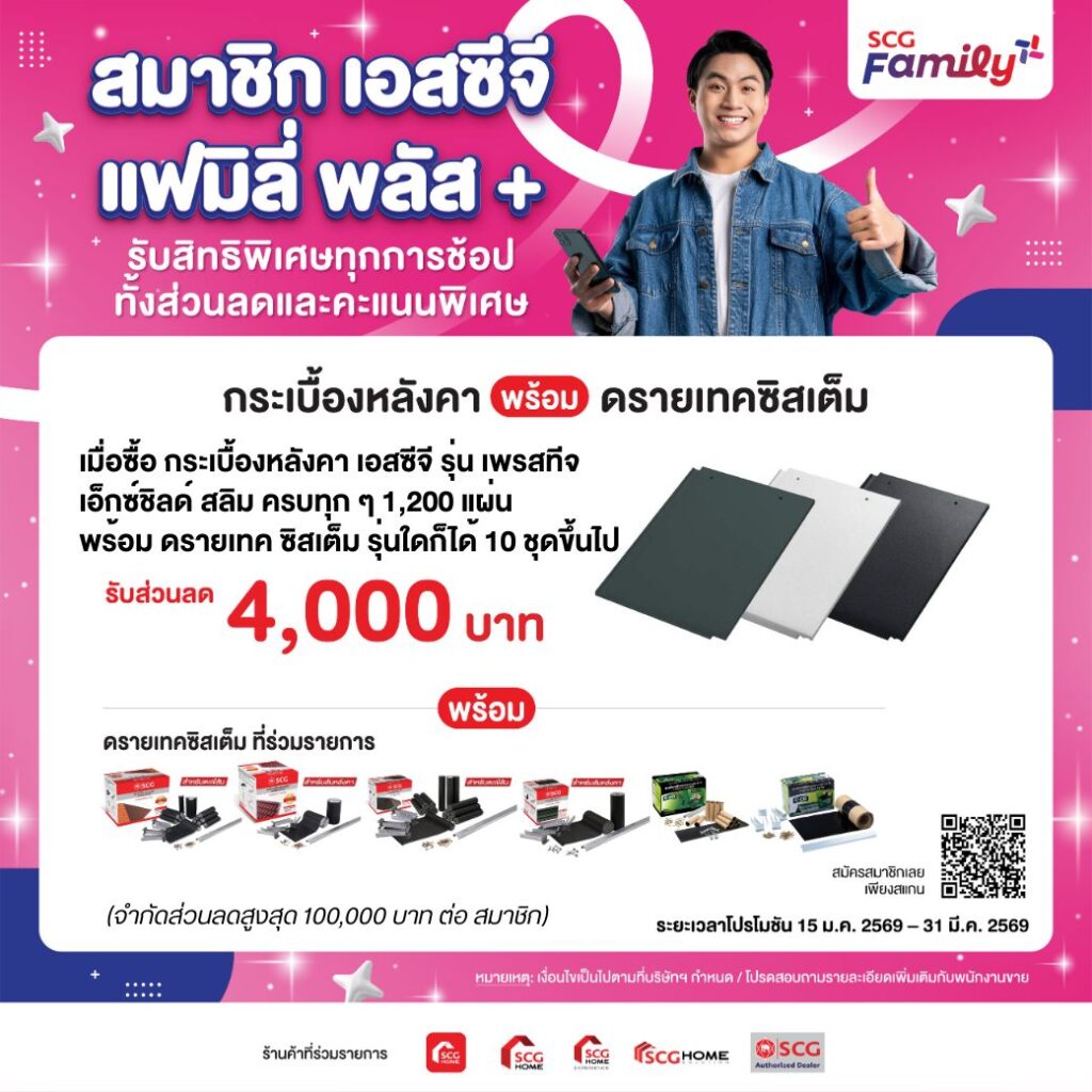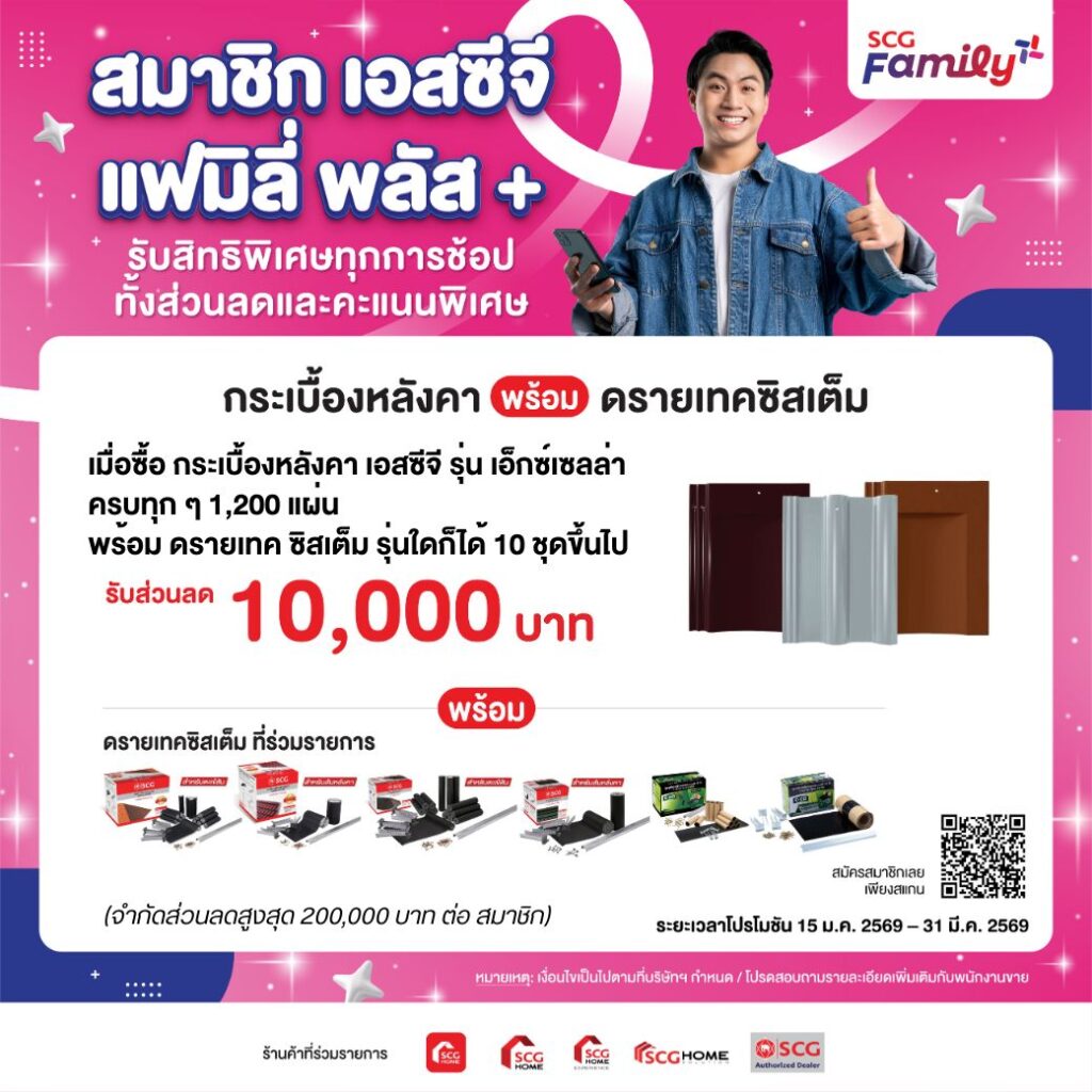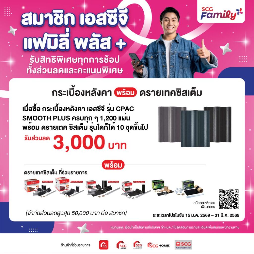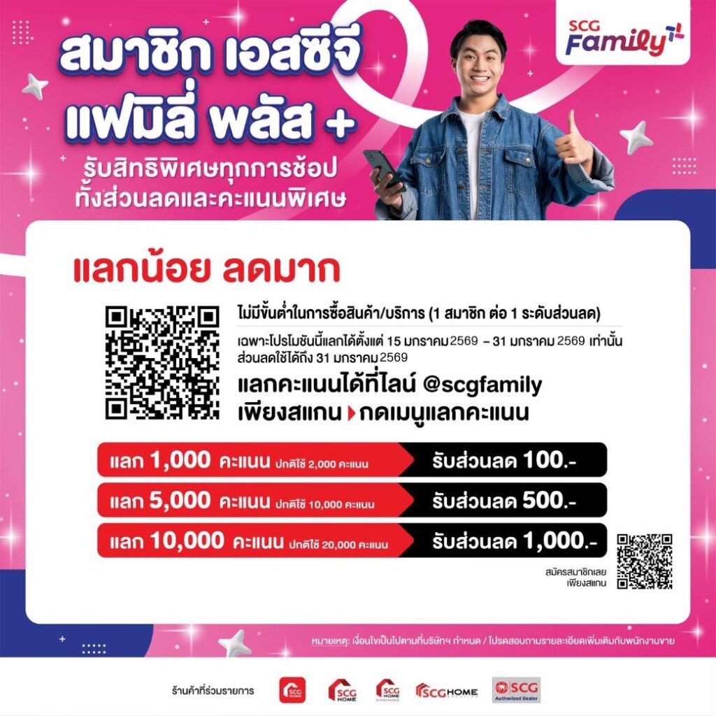 โปรโมชั่นสุดพิเศษสำหรับสมาชิก SCG Family Plus+ เริ่มตั้งแต่วันที่ 15 มกราคม – 31 มีนาคม 2569 มอบความคุ้มค่าที่มากกว่าการซื้อสินค้าทั่วไป เพราะสมาชิกจะได้รับทั้งส่วนลดพิเศษตามเงื่อนไขที่กำหนด และคะแนนสะสมเพิ่มในทุกยอดการซื้อ